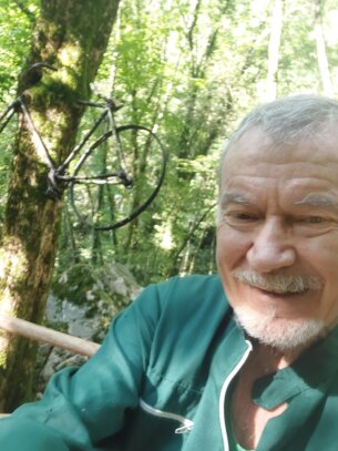 Il gruppo dei visitatori di Roncola Tour in posa antistante la bicletta sull'albero