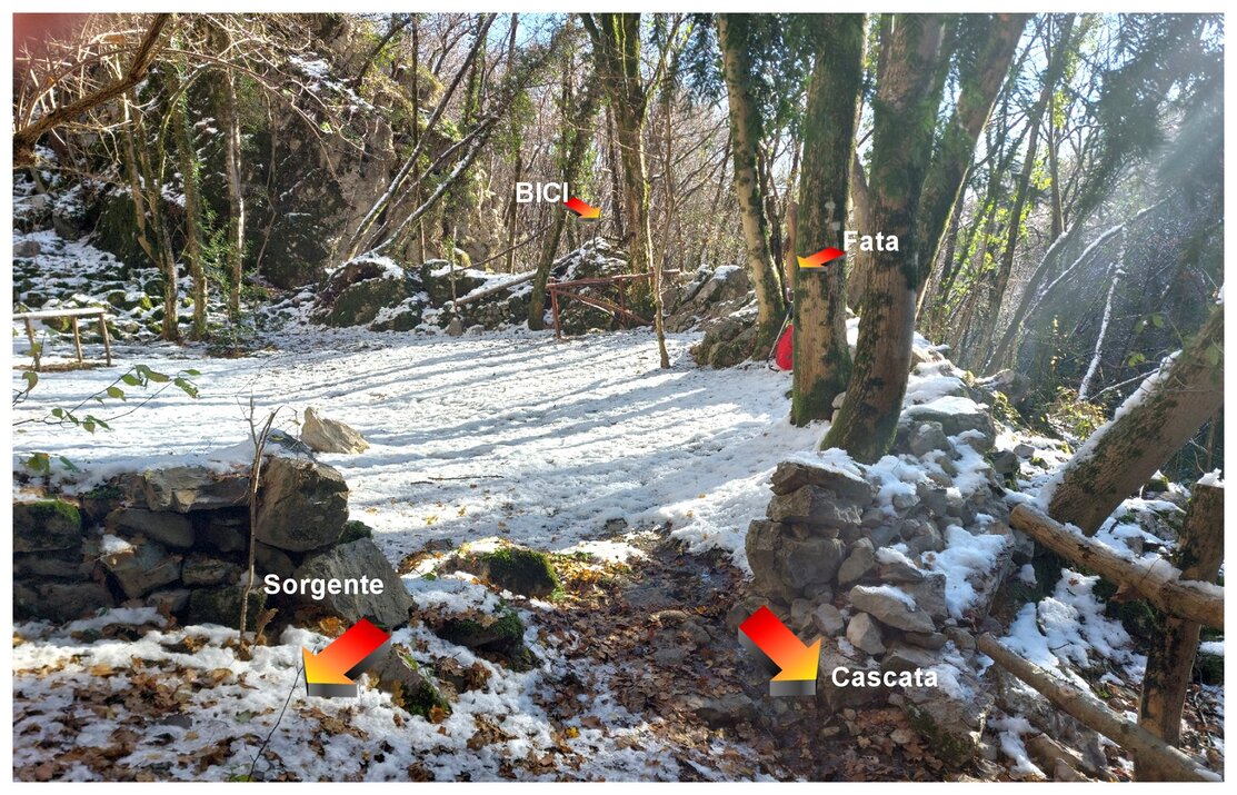 Vista della radura con ubicazione della Bicicletta sull'albero, la Fata e le direzioni per la cascata e la piccola sorgente