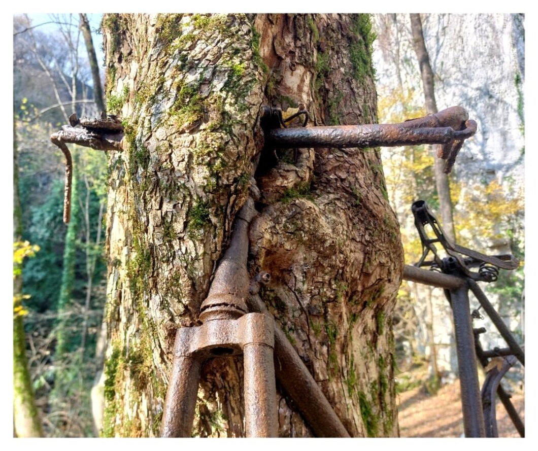 L'albero è cresciuto ed ha incorporato la bicicletta semplicemente appoggiata
