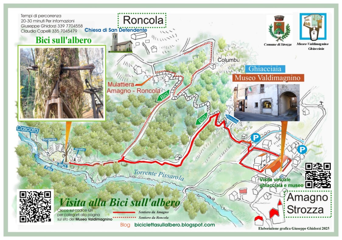 Una bella escursione! Un numeroso gruppo di turisti organizzato dal Roncola intour, percorrendo l’antica mulattiera che scende da Roncola, hanno deviato su di un sentiero laterale (con indicazione) per visitare la “Bici sull’albero” posta in una particolare radura, forse un antico ricovero per il bestiame, posto in fregio al torrente Pissarola a ridosso di una parete rocciosa. Dopo avere esplorato i vari aspetti naturalistici del sito, sono scesi percorrendo il sentiero che si ricollega più in basso alla mulattiera per giungere fino al borgo di Amagno. Una breve pausa per saziare la sete, e suddivisi per gruppi di quattro, hanno visitato sia il Museo Valdimagnino che la Ghiacciaia. Terminata la visita il gruppo con due pulmini è poi rientrato a Roncola.